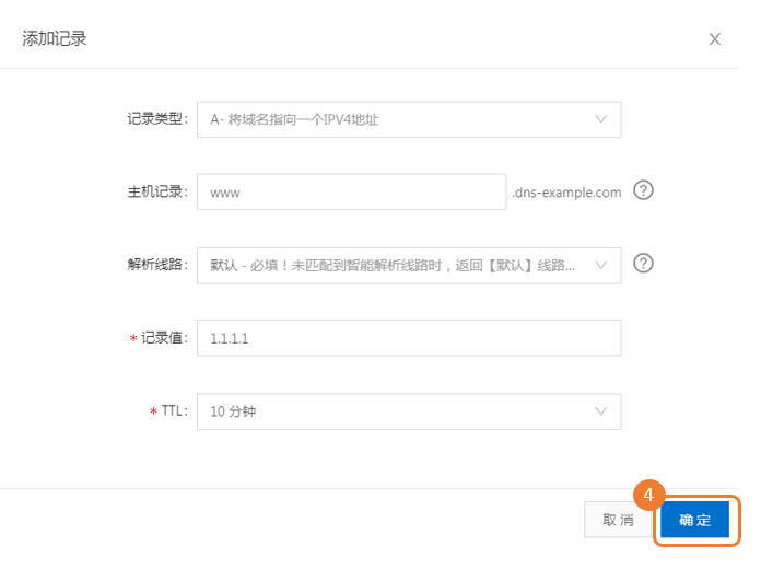 主機記錄:一般是指子域名的前綴(如需創(chuàng)建子域名為www.dns-example.com, 主機記錄輸入 www;如需實現(xiàn)dns-example.com,主機記錄輸入 @)。